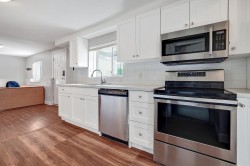 This spacious and updated RANCHER WITH FULLY FINISHED BASEMENT offers versatility and comfort for multi-generational living or investment potential. The main level features 3 bedrooms and 2 bathrooms, including renovated kitchen with quartz countertops, new cabinetry, and stainless steel appliances. New blinds and laminate flooring throughout, complemented by large windows and a gas fireplace in the living room. Mud room has newer washer/dryer, leading to balcony. The double garage and expansive driveway provide ample parking for multiple vehicles. Downstairs is a self-contained 2-bedroom suite with its own updated kitchen, full bathroom, separate entrance, and dedicated washer/dryer—perfect as a mortgage helper or in-law accommodation.
