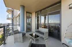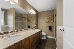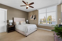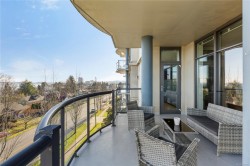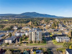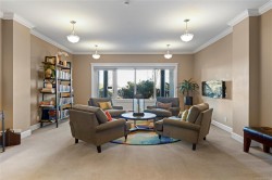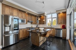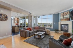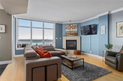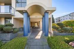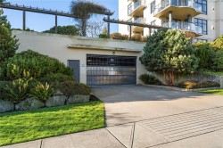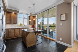 Breathtaking ocean views at Marine Vista, one of Nanaimo’s most prestigious and impeccably maintained concrete residences. From the elegant lobby to the peaceful, grassed courtyard, the building exudes luxury, privacy, and pride of ownership. This spacious 2-bedroom plus den, 2-bath home showcases stunning ocean, marina, and mountain views from two decks. High ceilings and expansive windows fill the home with natural light, highlighting its modern design and refined finishes. The chef-inspired kitchen features stainless steel appliances, abundant cabinetry, and generous counter space. A patio sliding door leads to a large covered deck, and there is a 2nd private deck off the primary bedroom. The primary suite includes a spa-like ensuite with double sinks, separate shower, and luxurious bathtub. A versatile den is ideal for a home office or studio. 2 underground parking stalls and small storage locker, gas heating and cooking are included in the strata fee. All data and info approximate