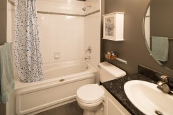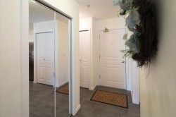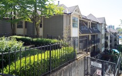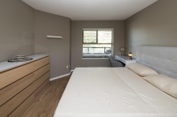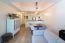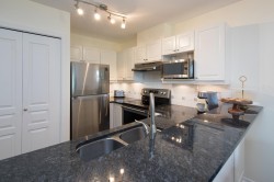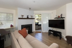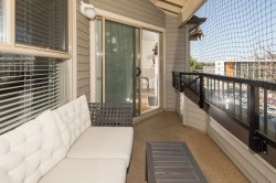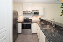 2 Big Dogs OK in your top floor one bedroom condo with covered balcony and green belt / city views. The spacious living room has a gas fireplace and a nook for your computer / home office. There is easy to clean laminate flooring throughout. The kitchen has stainless appliances, granite counter tops and and breakfast bar. There is lots of space for dinner parties and you can easily have larger dining table. The master bedroom can fit a king sized bed and has a walk in closet plus. The cheater en-suite bathroom can be entered from the master bedroom or the foyer and features a larger soaker tub. 1 Secure Underground Parking, 1 Locker, bike room, gym, and beautifully landscaped garden courtyard. Bus Stop on 12th, steps from New Westminster Quay, The Boardwalk, Shopping, and SkyTrain.