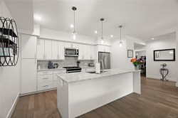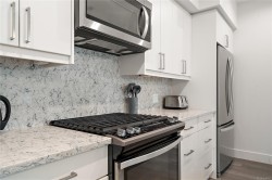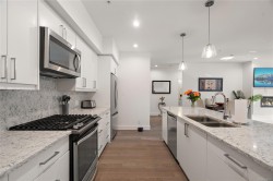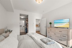 Modern Comfort at Regatta Park. This 2 bed/2 bath home blends style, function, and lifestyle. The bright open layout showcases a gourmet kitchen with quartz counters, premium cabinetry, gas range and oversized island, flowing into a living room centered by a sleek gas fireplace. The primary suite offers a walk-in closet with custom organizers and a spa-inspired ensuite with heated floors and double vanity, while a split-bedroom design provides privacy for guests or a home office. Standout features include an expansive 300+ sq.ft. deck spanning the full width of the home, ideal for morning coffee or evening entertaining. Additionally, there are 2 parking stalls (1 secure underground with bike cage, 1 outdoor), a separate storage locker, and pet-friendly bylaws. All this just minutes to Sidney, Swartz Bay Ferry Terminal and YYJ Airport—modern living with everyday convenience.