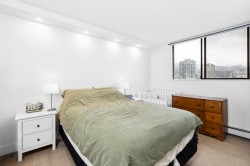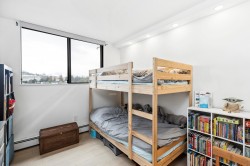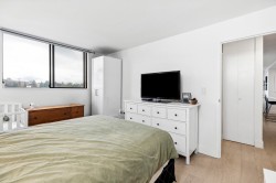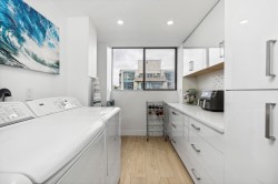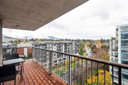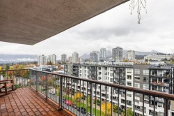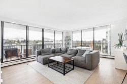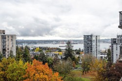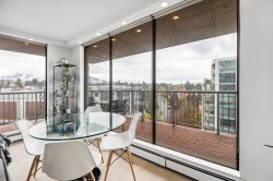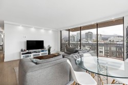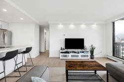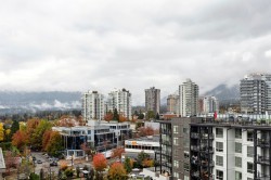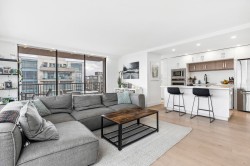 Beautifully renovated NE corner suite at 'Keith 100,' offering 2 bdrms, 2 baths, and 964 sq/ft of tasteful, modern updates. The open-concept layout features floor-to-ceiling windows, infusing the space with natural light and leading to a 200 sq/ft wrap-around balcony w/ serene mountain and inner harbor views. The contemporary kitchen boasts sleek white cabinets, s/s appliances, a built-in oven, & a central island w/ a cooktop & bar seating, ideal for casual dining and entertaining. The spacious primary bdrm accommodates a King bed, large closet, & a stylish 3-piece ensuite. The second bdrm is perfect for family or guests. 'Keith 100' has just 4 suites per floor! Maint incls heat and hot water. Conveniently located on Victoria Park & near all Lonsdale amenities.