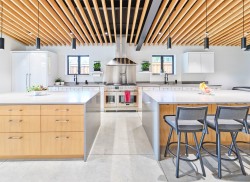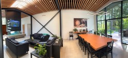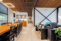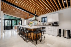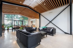 Award-winning contemporary home backing onto a private forested greenbelt. 2021 Georgie Award finalist, this 5,400+ sq. ft. quality custom residence (2019) features striking steel, glass, and concrete design with a sleek black exterior. Open-concept main floor with soaring ceilings, floor-to-ceiling windows, and statement island fireplace flows to the covered patio and expansive terrace. 700 sq. ft. chef’s kitchen with dual islands and premium appliances direct access to large, beautifully landscaped property. Lower level offers three en-suite bedrooms, large media/games room with kitchenette, and home theatre. Radiant concrete floors, home office, gym space, and ample parking. Quiet setting just 15 minutes to downtown via Ironworkers Bridge. A truly rare opportunity.