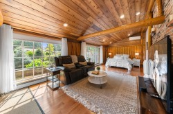 Located on a quiet cul-de-sac, this exceptional Blueridge home blends history & modern living on a flat, sunny lot, that is just under 13,000 sq/ft. With over $800,000 in upgrades: sandblasted and re-stained logs, new windows, doors, plumbing, electrical, roof, drainage, heated floors, bathrooms, A/C, Italian kitchen, EV charging etc, there is nothing you need to do but move in. The 4-bed home includes a private master suite w/seating area, ensuite, infrared sauna, and attached office w/ separate entrance. Entertain outdoors with your private gazebo, full outdoor kitchen & custom sauna, all surrounded by landscaped gardens w/ irrigation. With room for an RV/boat, abundant storage, & access to trails, mountain biking, & top schools, this home offers the ultimate North Shore lifestyle.