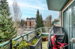 Bright & Spacious Corner Penthouse with Stunning Mountain Views! This incredible corner penthouse offers privacy, abundant natural light, and 1,156 sq. ft. of thoughtfully designed living space. Features include 2 large bedrooms, 2 full bathrooms (incl. a 3-piece ensuite), expansive living and dining areas with a cozy gas fireplace, a functional U-shaped kitchen with an eating area, in-suite laundry, ample storage, and a walk-in closet in the primary bedroom. All appliances were replaced in 2024 for added convenience. Additional highlights: crown moldings, no upstairs neighbors, 2 parking spaces, and access to a common party room. Building has brand new roof and all new pipes. Conveniently located near the 2nd Narrows Bridge and shopping.