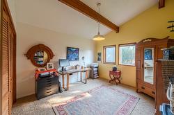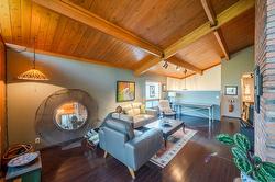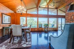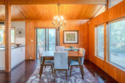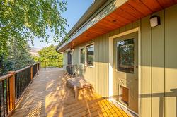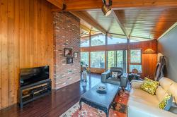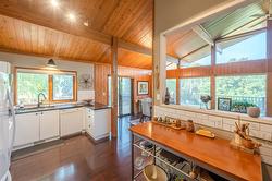 This thoughtfully designed residence features soaring vaulted ceilings with exposed beams, a wall of windows that flood the interior with natural light, and both open and covered decks to enjoy the scenery. The main level showcases hardwood flooring, updated light fixtures, and an updated sundeck, while the lower level includes an in-law suite—ideal for extended family, guests, or potential use as an Airbnb.