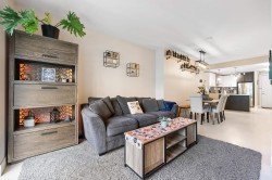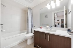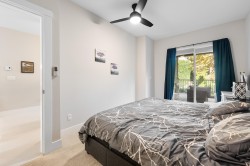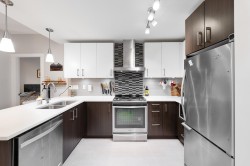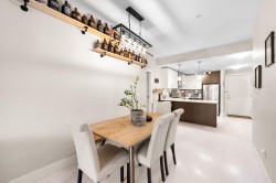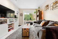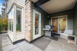 This quiet, ground-level corner unit offers over 1,000 sqft of modern living space, including 2 beds, 2 baths, and a versatile den perfect for an office or flex space. The open-concept layout features a contemporary kitchen with quartz counters, stainless appliances, and a cozy electric fireplace in the living room. Step outside onto a spacious 300+ sqft wrap-around patio, ideal for entertaining. Located just steps from Gates Park, Coquitlam River, trails, shopping, and transit, this boutique building provides a peaceful, friendly community with bike storage and an amenity room. Experience spacious, comfortable living in a prime, tranquil setting.