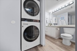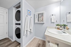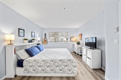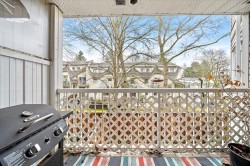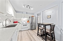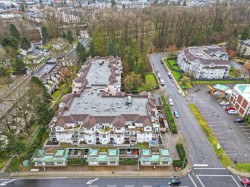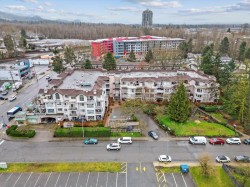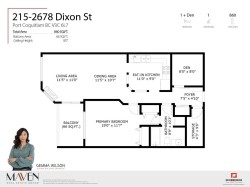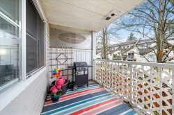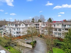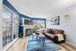Perfect starter condo or downsizing condo! This updated 1 bed and (enclosed) den is centrally located and move in ready! Enjoy updated laminate flooring throughout, granite countertops in both kitchen and bath with tons of storage options with new dishwasher and fridge. A bright and functional open layout dining/living room with a cozy gas fireplace and have your morning coffee on your east facing balcony. Fully covered patio for year round BBQ! Primary bedroom offers 2 closets, cheater ensuite that will fit a king size bed and more! The den has been outfitted with a barn door for privacy as a guest room or office. Spacious in suite storage unit included. Nature lovers have easy access to Coquitlam River trails, shopping, transit and parks. Bonus: gas & hot water included in strata fee!