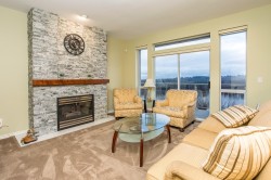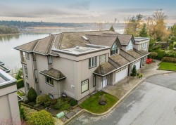Incredible, Oversized, View Townhouse in Citadel Bluffs. Front row with expansive balconies, views of Fraser River, Surrey skyline, Port Mann Bridge and Douglas Island. Spacious principal suite features an updated five-piece ensuite with double walk-in shower, Jacuzzi soaking tub, & walk-in closet. Four bedrooms up, fourth ideal as a vaulted office with built-ins. Updated LG laundry, quartz counters, skylights, and a circular staircase in a travertine-tiled grand foyer. Renovated kitchen with all new matching Samsung stainless appliances opens to eating area & family room with balcony access. Fully finished, over-height basement with rec room, wet bar, gas fireplace, bath, storage, & patio access. Side-by-side garage. Three gas fireplaces, central A/C, four baths, light-filled throughout.