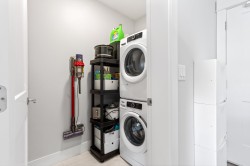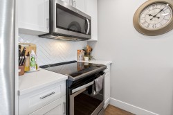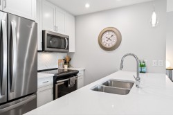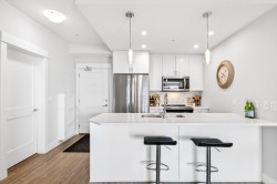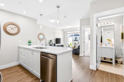 Welcome home to this bright & beautifully appointed 1 bed & den upper-floor condo offering 9ft ceilings, laminate flooring, quartz counters, & stainless appliances. Enjoy a large, sunny west-facing balcony with mountain views—perfect for relaxing or entertaining. The versatile den is ideal for a home office, while the spacious laundry room provides extra storage. This home comes with two storage lockers, including a large locker conveniently located on the same floor. The well-managed building features impressive amenities such as E/V charging, car wash, dog wash, playroom, & two party rooms. Located next to Poco Rec Centre, close to downtown Poco, & just a 5 min walk to the West Coast Express. Bonus: free membership to the Rec Centre, Library, Gym, & Pool!