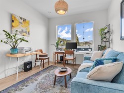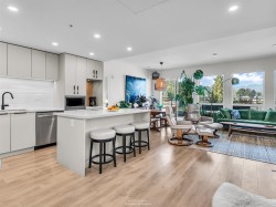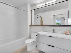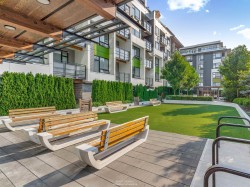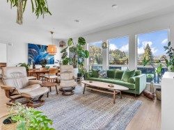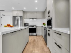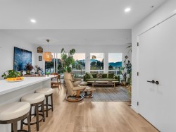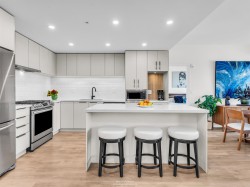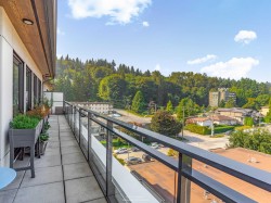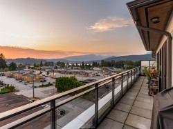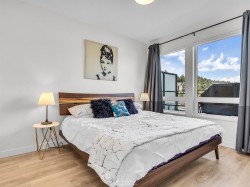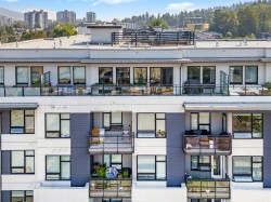 Spacious 2 bed, 2 bath penthouse condo in the George by Marcon in Port Moody. Enjoy the spectacular sunsets and Mountain views ( partial ocean views) from the large balcony. Open floorplan with high ceilings and great light! Air conditioned. Full sized stainless steel appliances including a gas stove. Tons of storage! Motorized roller blinds throughout. Blond oak laminate flooring. Both bedrooms are large enough for a king sized bed and have spacious walk in closets. Primary bedroom is ensuite with radiant in-floor heating and double vanities. Laundry room has side by side washer and dryer. Two parking stalls and a large private storage room. Located just 5 minutes away from both Moody Centre SkyTrain Station and the West Coast Express. Balance of new home warranty. Pet friendly building.
