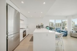 PANORAMIC VIEWS. ELEVATED LIVING. UNMATCHED CONVENIENCE. Wake to stunning views and natural light through floor-to-ceiling windows in this sophisticated home. The 250+ sq. ft. wraparound balcony offers seamless indoor-outdoor living—perfect for morning coffee or sunsets. Features include A/C, premium Miele appliances, engineered hardwood floors, and an open layout for entertaining. Steps to restaurants, shopping, and conveniences; minutes to Richmond Centre, YVR, and the Canada Line. Enjoy resort-style amenities including a double-height fitness centre, lounge, guest suite, music/karaoke rooms, private mahjong room, and 25,000+ sq. ft. of landscaped outdoor space. Includes two side-by-side parking stalls, the second valued at approx. $40,000. Some photos digitally staged and/or decluttered