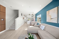 Proud Ownership! Gorgeous Corner 3 BR 2.5 BA townhouse with picket fence front yard in the fast growing Hamilton Area. Nestled on a quiet street with unobstructed view of greens & North Shore mountains. Quality built by DAVA & meticulously updated by the Owners with brand new light coloured flooring & bold designer colours. Quiet Corner unit with extra windows offers tons of natural light. Gorgeous 9 ft main floor with entertainment size Living, Dinning & Kitchen featuring quartz counter, stainless steel appliances & HRV. Downstairs tandem garage had been converted to a huge entertainment room or 4th bedroom with 2 windows. One blk to transit and 2 blocks to community school. 5 min drive to Queensborough Landing Shopping Centre, 15 min to Richmond Center and Metrotown w/Easy access to Hwy.