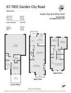 This super bright and clean 4 bedroom townhome offers 3 FULL bathrooms & the coveted side x side double garage. With 1416 SF of spacious living, this great home features brand new laminate floors on all 3 levels, fresh paint, bright kitchen with eating area, cozy gas fireplace, insuite laundry, 2 balconies and patio area. Excellent floor plan that includes 1 bedroom and full bath on the first floor – great for inlaws, teenagers, office or home business! All this in a great complex with low maintenance fees that include city utilities. Located just steps to the Garden City Shopping Mall with Save-On foods, Shoppers Drug Mart, restaurants, CIBC, coffee shops & more. Excellent location close to transit, parks, Palmer Secondary and Bridge Elementary. Pets & Rental Allowed. Ready to move in!