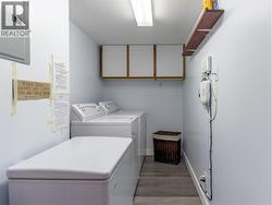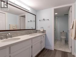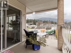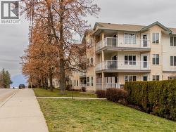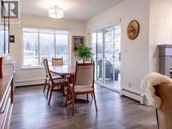 Tastefully renovated corner unit in the desirable 55+ MacIntosh Grove, offering easy, low-maintenance living just steps from downtown. This bright and spacious home features just under 1,300 sq. ft. with 2 bedrooms and 2 bathrooms, and has been recently updated with new flooring, a renovated kitchen with new appliances and countertops, fresh paint, and updated bathrooms. The inviting living room includes a newer AC unit, cozy gas fireplace (included in the strata fee) and flows seamlessly into the formal dining area and eat-in kitchen with access to a wrap-around, covered balcony featuring mountain views. The well-designed layout offers generous room sizes, a primary bedroom with walk-in closet and full ensuite (dual vanities). The kitchen provides ample cabinetry, tile backsplash, stainless appliances. A separate laundry room includes extra storage and room for a freezer. Convenient elevator access ensures effortless entry to this unit—simply move in and enjoy. MacIntosh Grove amenities include underground parking, RV parking, a common gathering room with kitchen, craft room, exercise room, and workshop. Public transit, shopping, restaurants, and downtown are all within walking distance. Quick possession available. (id:27)