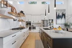 A true masterpiece! located in the highly desirable Upper Lakeshore area of Salmon Arm. Set upon 0.85 acres includes upper and lower property that extends to the other side of lakeshore Rd. This exceptional executive home represents the epitome of luxury living. Quality built with ground-up insulated concrete construction, the fully custom designed home offers over 4,800 sq ft of refined living. High end finishes include quartz countertops throughout, engineered hardwood floors, and soaring cathedral ceilings, gorgeous kitchen, high end appliances, Wet bar/beverage area and walk in pantry. Large windows and patio doors flood the home with natural light while showcasing breathtaking views of Shuswap Lake. Massive covered upper deck is just a hint of the Outdoor living below, Unmatched with a new 20’ x 40’ saltwater pool featuring a power retractable cover, a full poolside kitchen and bar top, new hot tub, all-new professional landscaping of the entire property, beautiful pergola sitting area and fenced playground with commercial grade swing. The impressive 60’ x 35’ shop includes in-floor heat, a 14’ door, and bathroom, A fully self-contained, updated 2-bedroom carriage suite offers independent guest space or income potential. Extensive custom renovations and updates completed over the last three years reflect impeccable attention to detail throughout this truly remarkable property. Located within just 5 minutes of downtown Salmon Arm, 10 min to beach/boat launch. (id:27)