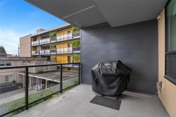 This almost-new 2 bed, 2 bath home offers 1,062 sq.ft. of thoughtfully designed living space in the heart of Sidney. As you enter, a spacious foyer and engineered hardwood floors lead to a stunning kitchen featuring Kitchenaid stainless appliances, quartz counters and backsplash, slow-close cabinetry, under-cabinet lighting, and a peninsula overlooking the bright great room. Large windows, 9’ ceilings, and an electric fireplace enhance the living space, which opens to a massive 10’4 x 9’5 covered patio—ideal for outdoor living. The generous primary bedroom includes two closets and a sleek 3-piece ensuite with a walk-in shower. A second bedroom with a Murphy bed sits opposite, next to the main 4-piece bath. A separate den adds versatility as a home office or storage. The Quartet is pet-friendly (no size limit), rental-friendly, and has no age restrictions. It’s also a 100% non-smoking building. Just steps to Beacon Ave, the ocean, parks, and trails—enjoy a true West Coast lifestyle.