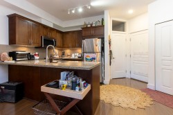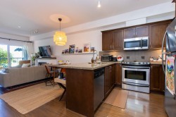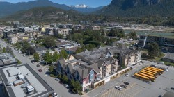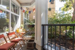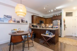 Private expansive 810 SF one bedroom + large den suite at the popular Artisan! Incredibly central yet very quiet on the interior courtyard level away from streets offering SE exposure, patio w/ partials views to the Chief. Great open plan for entertaining w/ 9 ft ceilings, granite counters, wood shaker cabinets, counter seating, SS appliances, dining area, electric f/p. Generous laundry/storage rm, additional closet for pantry/gear, primary bedroom w/ WI closet + room for king bed + desk. Den offers room for 2nd bed, office, gym, nursery. Walking distance to farmer's market, shopping, estuary + waterfront trails, Sp’akw’us Feather Park, breweries, library across street. One secured parking w/ 8ft clearance, bike rm. Easy access to common courtyard. Freshly painted ready for your move in!