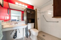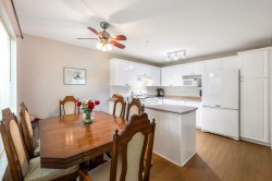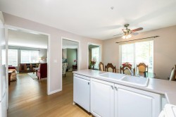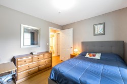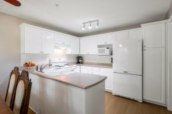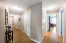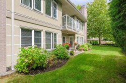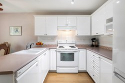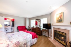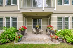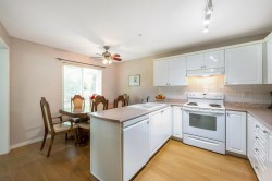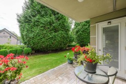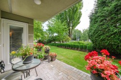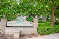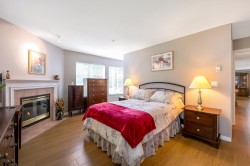Enjoy this immaculate 1,367 sqft rancher like, WHEELCHAIR ACCESSIBLE Strawberry Hill condo. This SOUTH FACING 2 bedroom, 2 bath, freshly painted, centrally located condo is move-in ready. It features a large airy living room w/ crown moulding, big windows & plenty of natural light, in floor radiant heat & 2 natural gas fireplaces. The kitchen is equipped w/ ample counter & cupboard space, white appliances & adjacent nook. The primary bedroom is large enough for all your furniture & the ensuite is a fully walk in bathroom & shower. The walkout garden patio extends your living space, perfect for your green thumb. For your convenience, it has its own in suite laundry, storage & TWO PARKING STALLS. Enjoy the proximity to schools, daycare, transit, library, shopping, temples, Hwy 10 & Bridges.