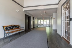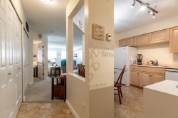 Extremely well maintained huge one bedroom unit on the ground floor of Surrey Town Manor. With almost 900sqft of living area, you feel like you're living in a house. Large kitchen with eating area opens onto a real dining room leaving ample space for full size furniture in the living room. Large 100sqft patio faces the interior of the courtyard. Primary bedroom is the largest you will see in a one bedroom with double walkthrough closets and an ensuite bathroom. Low maintenance fees of $312. 1 Underground parking spot. Close to shopping, restaurants and bus.