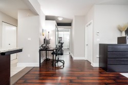 SALUS BY ADERA: 1-bedroom + den, 1-bath home with 9ft ceilings, an open layout, and large windows that fill the space with natural light. The thoughtful den includes built-in closets, creating a flexible work-from-home nook with valuable extra storage. The kitchen features granite countertops and stainless steel appliances, and the private balcony is surrounded by mature trees—perfect for quiet mornings or evening unwinding. Includes 1 parking stall and 1 storage locker. Enjoy exclusive access to the Salus Aqua Club with a heated saltwater pool, hot tub, sauna, steam room, yoga studio, fitness centre, spa, party room, playground, and rooftop patio. Rentals and 1 pet allowed. Close to transit, schools, shopping, and Hwy 91 & 99—ideal fit for first-time buyers, downsizers, or investors.