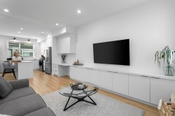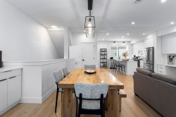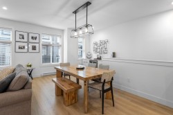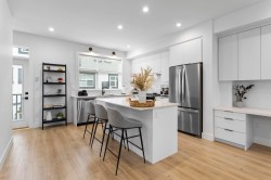 Welcome to Clayton Street - a modern, 2021-built townhome offering almost 1,900 sq. ft. of thoughtfully designed living space. The open-concept main level features a kitchen, dining, and living area, plus a custom bar with wine fridge and extensive built-ins. Step out from the kitchen to a deck perfect for BBQs and entertaining, with a large ground-level patio and fenced yard. Upstairs has 3 bedrooms, including a primary suite with stunning ensuite and walk-in closet. The large bonus room downstairs can serve as a fourth bedroom. Double side-by-side garage is roughed-in for EV charging. Part of an Energy Star–certified community with remainder of the 2-5-10 New Home Warranty, all near parks, shops, cafés, and schools - this is modern townhome living done right.