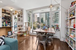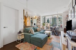 RAFFLES ON ROBSON – 1 BED + DEN + SOLARIUM Bright & functional home in one of DT Vancouver’s most connected locations! This open layout features a modern kitchen w/ Miele & Liebherr appls, stone counters & custom cabinetry. Enjoy a separate den for your office, a sunlit solarium for lounging or creative space, plus a private balcony for fresh air & city views. Relax in the spa-inspired bath w/ soaker tub + separate shower. Fantastic building amenities: concierge, gym, whirlpool, theatre, lounge, BBQ deck & bike storage. 1 parking incl. Steps to Robson, Yaletown, seawall, library, Rogers Arena, shops, dining & transit. A walkable, well-kept home in a prime location!
