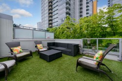 AMAZING 3 level LIVE-WORK Townhouse Loft w/rooftop terrace in the Heart of the City! This Urban oasis features a total of 725sf of outdoor living space & 845sf of interior. Open grand living w/20' ceilings, massive windows, fabulous light, City & peek-a-boo Mountain Views! L-shaped kitchen w/tons of storage and counter space. Laundry storage room, back entrance to Parking/bike room. 2nd level Primary bedroom w/quiet patio to mezzanine & loft with built in wall-bed doubles as a second bedroom. Sundeck that leads up to 3rd level, secluded HUGE ROOF terrace, great summer entertaining! Spectrum offers concierge, excellent club facilities, gym, indoor pool and more. 1/2 blk to Stadium Skytrain, trendy restaurants, BC Place & Rogers Arena, Costco.