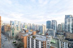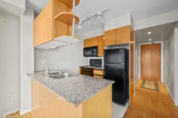 Bright & inviting 1 Bed 1 Bath + Den on the 18th floor with beautiful city views. South-east exposure and large windows in the living room and bedroom provide abundant natural light throughout the day. The kitchen features granite countertops and ample cabinetry which all opens seamlessly to the living area—ideal for entertaining. This rental-friendly suite can be sold fully furnished, making it a perfect turnkey investment or an excellent option for enjoying vibrant downtown living. The versatile den is ideal for a home office, pantry, or extra storage. Located in the heart of downtown with restaurants, cafés, grocery stores, and transit just steps away. Amenities include a 24-hour concierge, indoor pool, sauna/steam room, fitness centre, and more. Pet-friendly with 1 Parking.