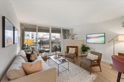 Professionally renovated concrete TOP FLOOR CORNER suite. Open plan kitchen with high end integrated appliances plus custom pantry/storage. The spacious living area features a cozy gas f/p and opens to a large covered balcony with open views. Incredible natural light floods the suite. Primary bedroom has room for a desk plus custom walk-in closet and spa-like en-suite bath. 2nd bed is spacious and bright. Ideally located in the heart of downtown, just steps to skytrain, shopping restaurants, groceries and entertainment. Very well maintained complex with brand new roof and upgraded plumbing underway and already paid for! Amenities include pool, hot tub, gym & games room and concierge. Secured parking plus visitor parking. Pet & rental (Airbnb) friendly. Sat Jan 24th 2:30-4:00.