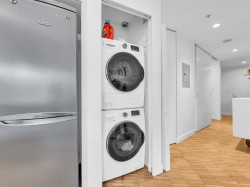 Live in the ICONIC WOODWARD'S Building! Here it is - your chance to own in one of Vancouver's most recognizable landmark buildings. This stylish and modern 1-bedroom + oversized den (with closet!) offers an open, light-filled layout overlooking a peaceful courtyard. The contemporary kitchen features stone countertops, gas range, and in-suite laundry, while exposed concrete ceilings and gallery-style walls give the space a cool, urban edge. Your strata fees include internet, heat, hot water, and gas, making this home as practical as it is beautiful. Enjoy incredible city and mountain views from the rooftop indoor/outdoor lounge and deck - complete with a state-of-the-art gym, outdoor hot tub, and 24/7 concierge. Just a 7-minute walk to Waterfront Station. Open house Saturday Jan 10th 2-4!