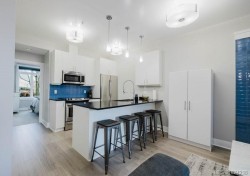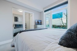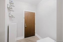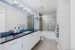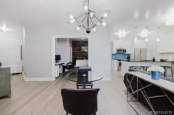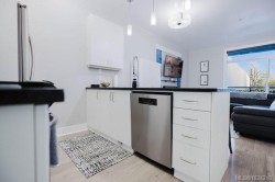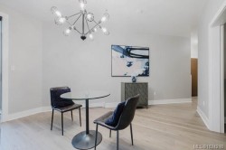 It's just perfect! A modernized corner unit set quietly within growing Mayfair neighbourhood, offering comfort and privacy. The freshly painted, open living area is warm and inviting, highlighted by updated flooring, a sleek electric fireplace and extra-wide sliding glass doors that lead to private northeast-facing balcony, filling the space with flow-through, soft morning light. A chandelier adds an elegant touch. The kitchen is well appointed w/ stainless steel appliances, double sinks w/ garburator, granite countertops, and a casual eating bar. This home offers two bathrms, incl a generous 4-pce ensuite in the primary featuring a deep soaker tub, tile flooring, under-cabinet lighting, and striking blue accent tile plus a convenient 2-pce powder room, alongside in-suite laundry w/ stacked washer & dryer. Both bedrooms are thoughtfully designed, w/ the primary bedroom offering a peaceful retreat and the second bedroom enhanced by a distinctive wood accent wall. A thoughtful touch!