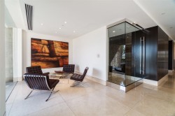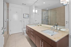A refined, like-new residence offering an elevated expression of contemporary living. A thoughtfully tailored, light infused floor plan offers open-concept living with well separated bedrooms, each featuring a private ensuite, along with a dedicated laundry area and versatile flex room. The sleek, modern kitchen is appointed with custom-milled German cabinetry, precision-fitted JennAir appliances, a central island, all granite countertops with continuous full height backsplash. The expansive living and dining areas are enhanced by an integrated electric fireplace, creating a sophisticated space for entertaining. Triple access to the south-facing balcony from both primary and second bedrooms, and main living areas blends the inside space with outdoors. Daylight views toward Inner harbour capturing ocean glimpses along with backdrop of Olympics. As twilight settles, the Inner Harbour lights provide a luminous ambiance, an elegant setting for hosting, dining or quiet enjoyment.