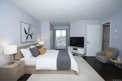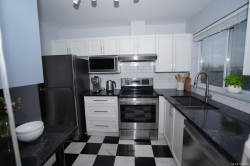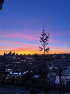 Enjoy bright, top-floor living with sweeping west-facing views in this beautifully updated home. Dramatic 15-foot vaulted ceilings, a skylight, and expansive windows fill the space with natural light, while engineered hardwood floors and a cozy gas fireplace create a warm, modern feel. The recently renovated kitchen features stone countertops, new appliances, and a tiled eat-in area that flows seamlessly into the formal dining space. Two generous bedrooms include a spacious primary with walk-in closet, updated ensuite, bonus office nook, and access to a covered deck, perfect for taking in the sunset views. Set in a well-managed building with a resident caretaker, secure underground parking, bike storage, and separate storage. Pet- and family-friendly, and ideally located within walking distance to downtown, Mayfair Mall, and Vic West. This move-in-ready home checks all the boxes.