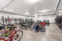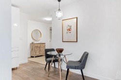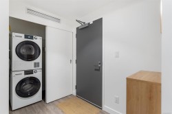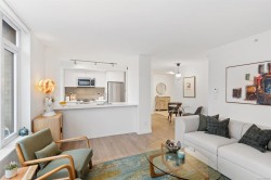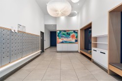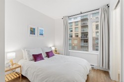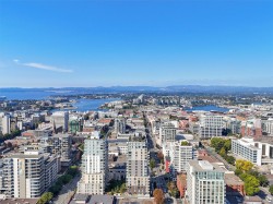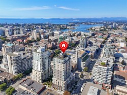 Spacious 6th floor 2 Bed, 2 Bath corner suite with south facing garden views, tucked away from street, in the heart of downtown Victoria. Primary bedroom features ensuite with soaker tub and walk in closet; second bedroom offers two large closets and nearby full bath. Smart layout separates bedrooms with open living space and ample storage. Bright kitchen with quartz counters, modern cabinetry, honeycomb backsplash, stainless appliances, long eating bar, and dining area. Large entry doubles as flexible space for office, workout, or extra storage. Big windows bring in natural light and city views, with roller shades throughout. Covered deck fits BBQ, dining, and plants—perfect for enjoying the sunny exposure. Balance of 2/5/10 warranty, pets allowed, no AHOP/BC Housing approval required. Rooftop patio with incredible views, BBQs, seating, dog run, and garden plots. Secure underground parking with EV charging, full height storage locker, and bike storage. A must-see, act quick!