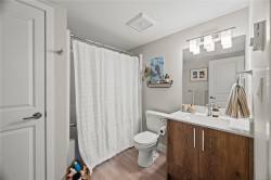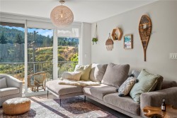 Bright and spacious 2 bed, 2 bath condo just steps from Thetis Lake and some of the best trails and recreation on the island! This 950+ sq.ft. home features a functional split-bedroom layout and south-facing exposure for tons of natural light. The large kitchen includes quartz counters, stainless steel appliances, and ample workspace. The living room opens to a generous, private balcony — no neighbours beside or across — perfect for relaxing or BBQing. The primary bedroom features a walk-through closet and ensuite, with the second bedroom and bath on the opposite side. Includes a large storage room across the hall, 1 parking stall, and lots of visitor parking. Only 9 units in the building with just two other owners on your floor and storage lockers across the hall! On the Galloping Goose and E&N bike paths and walking distance to The Nest Café and Six Mile Pub. Building amenities include bike/kayak storage and a fenced dog run. Pet-friendly with no size restrictions!