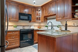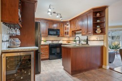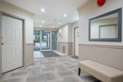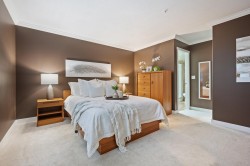 East Beach stunning 2 bed, 2 bath updated condo in White Rock! CORNER END unit is located on the quiet side of the building w/large windows on all sides for lots of natural light. Beautiful solid cherry hardwood floors, crown moulding, remodelled kitchen w/custom cabinetry & lighting, granite counters, wine fridge. Spacious & bright family room w/gas fireplace & large dining area for entertaining. Washer and Dryer new in 2022. Impressive sunny western exposed covered deck for BBQing. Lots of in-suite storage plus oversized laundry rm. Secure underground parking plus large storage locker. Maint. fee incl GAS. Just steps away from White Rock Beach & Semiahmoo Park. Minutes to HWY & US Border. Steps to transit. Move in ready for all ages, Bring your pet!