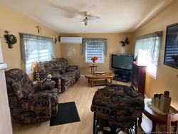 Ideal for first-time homebuyer This renovated 12' x 58' mobile home features two bedrooms, a kitchen with melamine cabinets, and a spacious living room with hardwood, laminate, and vinyl flooring. Heating is electric forced air, complemented by a heat pump. The windows are PVC. The exterior was completely renovated in 2024. A 14' x 18' carport is included, along with a large 7' x 13' shed located at the back. The lot is fully landscaped with a paved driveway. The land is leased at $125.00/month. Property is in excellent condition. Call for a visit!