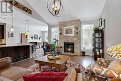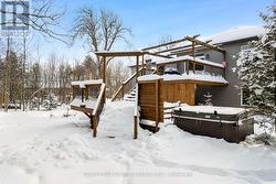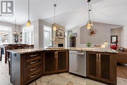 Welcome to Beckenridge Estates, where privacy, space, and style come together just 5 minutes from Carleton Place. This beautifully maintained 3 Bedroom, 2 Bathroom, 1,700 sq. ft. walkout bungalow sits on a stunning 1-acre treed lot, surrounded by extensive perennial gardens that create a peaceful, private retreat. Step inside to an inviting open concept main living space featuring a 13' vaulted ceiling and a cozy gas fireplace. The spacious kitchen is both functional and impressive with abundant cabinetry, Maytag appliances, an oversized granite island with breakfast bar, a bright eating nook, and a dedicated coffee bar. The primary suite is tucked away for added privacy and includes a spacious 5-piece ensuite with a glass shower and walk-in closet. On the opposite side of the home, you'll find two additional bedrooms and a full bathroom-ideal for family, guests, or a home office. The large finished walkout basement boasts a wood pellet stove adding even more warmth to the pine detailing. Enjoy the calming Zen-inspired fitness room or gather round the recreation area for movie nights or game day. Outside is where this property truly shines. Enjoy the sun and scenery from your private two-tiered 14' x 14' decks, unwind in the hot tub year-round, gather around the fire pit, and grow your own produce in the enclosed vegetable garden. Outbuildings offer excellent storage and flexible space for hobbies or a workshop. For outdoor enthusiasts, the home is also just a 1-minute walk to the OVR Trail, making it easy to enjoy ATVing and snowmobiling right from your doorstep. Country living without giving up the convenience of town amenities nearby. (id:27)