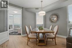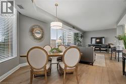 Corner Suite - filled with tons of natural light. 9' Ceilings, Welcome to Unit 603 @ 2121 Lakeshore Road, SW Corner Suite with both Lake and City Views. Blending contemporary elegance with soft, refined décor, to offer a serene, elevated living experience. The open-concept Living & Dining Room is ideal for both entertaining & intimate evenings at home. A separate Den provides a tranquil space to unwind while taking in the views. The custom Kitchen showcases white cabinetry, quartz surfaces, a breakfast bar, glass tile backsplash, LED pot lights, & stainless steel appliances. Tucked away from the main living area, the Bedroom Wing offers discretion & calm. A charming Hall Library welcomes you into the private quarters. The Principal Bedroom Retreat impresses with a cozy sitting area framed by a bay window, custom walk-in closet, a spa-inspired 3-piece Ensuite featuring heated tile floors, vanity w/quartz counters, step-in shower & linen closet. A spacious Second Bedroom, also highlighted by its own bay window & stunning views, ensures guests enjoy comfort & style. The Main Bath mirrors the luxe finishes of the ensuite w/heated flooring, white cabinetry, quartz counters & a step-in shower. In-suite Laundry w/ stacked washer/dryer. Engineered hardwood floors; custom blinds; tall interior doors; closets w/custom organizers, two linen closets. TWO Parking Spaces. Locker. Building Updates Include: 2 x Elevators, Lobby, FOB Lobby Access. Visitor Parking. Steps to Downtown Burlington's: boutiques, Performing Arts Centre, cafes and restaurants, Art Gallery, Waterfront Trail, library, seniors' centre, golf, transit, recreation, shopping & major highways. Welcome Home to Unit 603 at 2121 Lakeshore Road! (id:27)