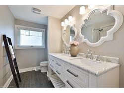 Welcome home to this beautifully updated detached home nestled in the highly sought-after south end of Burlington. The main floor has been thoughtfully opened up, featuring a stunning chef’s kitchen with a large island offering seating, quartz countertops, and ample storage. The adjacent dining area is flexible and can easily serve as a cozy living space, perfect for entertaining or everyday living. Upstairs, you’ll find the primary suite complete with a spa-like 5-piece ensuite featuring a freestanding soaker tub, glass shower, dual vanities, and heated floors. Two additional bedrooms share an updated 5-piece family bathroom. The lower level offers a bright and inviting family room with a wood-burning fireplace and walkout to a private patio, bringing in an abundance of natural light. The finished basement is ideal for movie nights or game evenings, providing a comfortable retreat for the whole family. Situated on a mature lot with exceptional privacy, this home is just steps from the lake, parks, and scenic trails offering the perfect blend of nature and convenience. Don't miss your chance to own this idyllic property in one of Burlington’s most desirable neighborhoods!