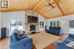 This stunning 5-bedroom, 2.5-bathroom home spans over an energy efficient 3,800+sq/ft and is perfectly positioned to overlook the breathtaking Grand River. Nestled on a generous lot overlooking rolling fields at the back and river access just across the street, it’s an ideal setting for those who love the outdoors. Adding to its appeal, a massive 100’ x 40’ detached shop provides endless possibilities for hobbies, storage, or business use (w/ high speed fibre internet). The main floor boasts a spacious and inviting layout with 9ft ceilings, featuring a custom kitchen with a wood-paneled ceiling, stone countertops, a stylish herringbone backsplash, and a large island—perfect for gathering with family and friends. The adjacent dining room, with its tray ceiling and wood accent wall, offers picturesque views of the Grand River. The oversized great room is a true showstopper, complete with a floor-to-ceiling stone fireplace, vaulted ceiling, and expansive windows that frame stunning views in every direction. Step through one of two patio doors to your private outdoor oasis, featuring a large covered patio and built-in outdoor kitchen, ideal for entertaining. On one elevated side of the home, the primary suite offers a peaceful escape with a walk-in closet and a luxurious ensuite, complete with a custom tile shower. The second level hosts four additional bedrooms and a full 4-piece bathroom. The versatile basement offers even more potential, with its own private entrance from the attached double garage, making it an excellent option for an in-law suite or additional living space. For those needing extra room for vehicles, equipment, or recreational toys, this property delivers! The huge concrete parking area and driveway ensure ample outdoor storage/parking for vehicles/trailers. Don’t miss this rare opportunity to own a spectacular home in a prime location with endless possibilities! Luxury Certified (id:27)