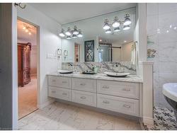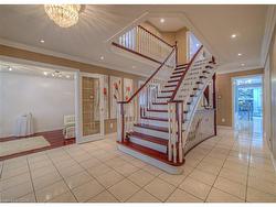 Former Model home occupied by loving original owners! Absolutely stunning home with In-law or Teenager's suite on a private side of the home with walk-in closet and full bath! Meticulously maintained Feng Shui oriented home with a Heated Sunroom and a Stunning staircase built to size in the home! You will be charmed by the elegance and charm of this home with extensive Crown molding, Hardwood, Wrought iron special designed mirrors & cabinetry, Extensive Granite & Marble as soon as you step into this home that just keeps going on and on. The home spans over 5,000 sqft of living space with 5 bedrooms, 3.5 bathrooms, amazing Sunroom with gas fireplace and heated marble flooring open to both sides of the yard with sliders, 4 bedrooms on second level with 3 full baths, Master bedroom with two Walk-in closets or make one into Nursery plus a Spa like ensuite with a Soaker tub, Glass shower, Heated towel bar, His & Hers sinks, marble heated floors; Fully finished basement with oversized L-shape Rec room with gas fireplace, Exercise room, extra pantry/wine cellar. The main floor has an elegant office with wood paneling, Formal dining room with a beautiful one piece special design mirror, Living room/working room for home business, Family room/Den with a cozy gas fireplace, modern Chef's kitchen with marble countertops with top of the line appliances! The yard is fully fenced, has mature trees and is full of beautiful perennials. The home was fully renovated in 2018-19 Kitchen, Basement, Sunroom, Mudroom, Spa Ensuite, Powerless Kinetico water softener with torking system, RO, Eaves Guard, All new potlights, All windows, Front door. Other updates include: Roof 2012, AC 2017, Central Vacuum, Furnace & Hot water heater Nov 2024, Gas hook up for BBQ. Double garage plus the interlock driveway can park 6 cars! Just minutes from 401, Shopping, Schools, Trails, This home is a rare find that offers a perfect blend of luxury and elegant living style in a family oriented neighborhood.