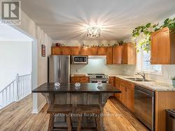 Welcome to this inviting raised bungalow tucked away on a quiet, sought-after side road just minutes from Owen Sound. Set on a private ONE ACRE property, GAS heat, this 3 bedroom with potential for a 4th, 1.5 bath home offers a comfortable and functional layout that feels easy to settle into from the moment you arrive. The open-concept kitchen and living area is filled with natural light from an oversized window, creating a bright and cozy space for everyday living. Step into the three-season lanai (spray insulated underneath) and enjoy peaceful views of the backyard in any season, with access to the rear deck-perfect for relaxing or hosting friends and family. Downstairs, the spacious rec room is warmed by a wood stove, making it an ideal spot for movie nights or quiet winter evenings. Potential for a fourth bedroom offers flexibility for guests, a home office, hobby space or large mudroom, along with a spacious laundry and utility room with plenty of storage. Outside, you'll find a fire pit area with garden shed and an additional shed with electrical, ideal for a small workshop or extra storage. The attached single-car garage fits a full-size pickup and includes a convenient man door to the yard AND access to the basement. Updates: Dec 2018 gas furnace with warranty remaining, new gas hot water tank, well pump, upstairs front windows, appliances, kitchen counter, carpet up and down. A GenerLink generator hookup at the hydro meter adds extra peace of mind, UV light, and water softener round out this well-cared-for home. Fibe Internet. Enjoy the peace of country living with the rail trail minutes away for snowmobiling, summer ATV rides, biking or walks, West Side amenities just minutes away and downtown Owen Sound under 10 minutes, 15 minutes to Sauble Beach. (id:27)