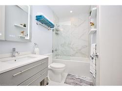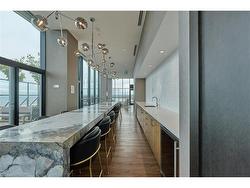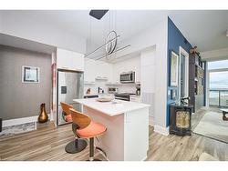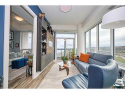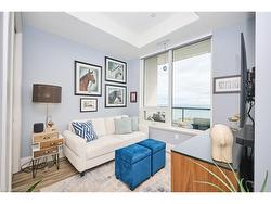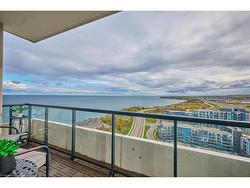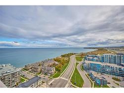 Perched high above the shoreline, this exceptional corner waterfront penthouse offers the refined comfort of a luxury residence paired with sweeping, unobstructed views of Lake Ontario and the Niagara Escarpment.Soaring 10-foot ceilings and expansive floor-to-ceiling windows flood the home with natural light, creating an inviting and sophisticated atmosphere throughout. Designed with entertaining in mind, the open-concept layout is complemented by premium flooring, designer-inspired bathrooms, and motorized Hunter Douglas remote blinds. The family room is anchored by custom built-in cabinetry and a striking fireplace, blending style and warmth. The living area flows effortlessly to a generous balcony—an ideal backdrop for morning coffee or sunset entertaining.Additional conveniences include two premium underground parking spaces located close to the elevator, along with access to an impressive collection of resort-style amenities. Residents enjoy a 24-hour concierge, rooftop terrace with BBQs and lounge areas, party room, fully equipped fitness centre, EV charging stations, and a dedicated dog spa for four-legged companions.Ideally situated steps from boutique shops, charming cafés, and fine dining, and just moments from conservation areas, marinas, local wineries, and major highway access, this location delivers an exceptional balance of lifestyle and convenience.This fully appointed penthouse suite represents a rare opportunity to experience the very best of waterfront living.