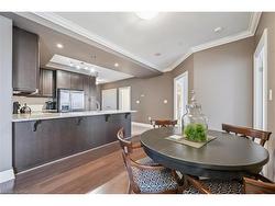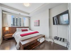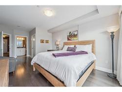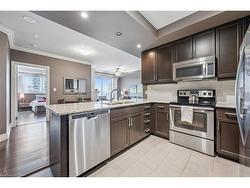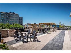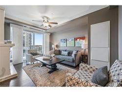 Welcome to RiverHouse, one of downtown Guelph's most sought-after condominium residences. This stylish turnkey suite pairs luxury finishes with an urban lifestyle just steps from the GO station, Sleeman Centre, Speed River and the city's best shops, dining, and downtown amenities. Inside, the open-concept layout is bright and inviting, with large windows and a private balcony showcasing panoramic city views. The kitchen features rich espresso cabinetry, granite countertops, stainless steel appliances, and an island with bar seating that flows seamlessly into the living and dining area. The living room offers elegant crown moulding, a fireplace feature, and sliding doors to the balcony - an ideal space for morning coffee or relaxing above the city. Both bedrooms are generously sized, with the primary suite offering floor-to-ceiling windows, a walk-in closet, and a spa-like ensuite with a glass-enclosed shower and stone vanity. A second full bathroom with a frameless glass shower serves guests and the secondary bedroom. Additional highlights include in-suite laundry, 2 underground parking spaces with an EV rough-in set up for future installation and a storage locker. RiverHouse provides a refined lifestyle with amenities such as a fitness centre, party room equipped with a bar/lounge, large outdoor terrace, and guest suite, all within a secure and well-managed building. A rare opportunity to experience upscale condominium living in the heart of Guelph's vibrant downtown core. All furniture can be purchased, see realtor remarks for further details.