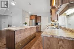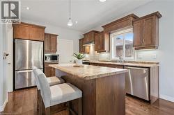 This custom-built executive bungalow offers style, function, and flexibility in one of East Guelph's most convenient locations! Situated on a 50-foot lot and surrounded by extensive, low-maintenance professional landscaping, this home impresses from the moment you arrive with its stamped concrete driveway and inviting curb appeal. Inside, the main level features beautiful hardwood floors and an open-concept entertainer's layout. The spacious living room boasts a vaulted ceiling and cozy gas fireplace, flowing seamlessly into the gourmet eat-in kitchen with stainless steel appliances, a central island with bar seating, and access to the large rear deck and patio. The main level offers three generous bedrooms, ideal for families or downsizers who still want room for guests. Downstairs, a bright and thoughtfully designed 2-bedroom, 2-bath legal basement apartment provides incredible versatility. With its own separate entrance, spacious living areas, full kitchen, in-suite laundry, and carpet-free finishes, it's perfect for multigenerational living or generating valuable rental income in retirement. New furnace, AC, and heat exchanger installed April 2024 with transferrable warranty. Set in a prime East Guelph neighbourhood close to parks, trails, amenities, schools, and quick Highway 401 access, this property checks all the boxes for those seeking comfort, quality, and lifestyle in a beautiful, easy to maintain package! (id:7525)