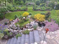Stunning RAVINE lot on quiet crescent! The views are incredible. Enjoy your morning coffee in the fabulous kitchen or on the gorgeous deck looking out onto the breathtaking Hungry Hollow ravine. 1/5th of an acre in town with beautiful gardens and tons of privacy. The house is in mint condition and offers four bedrooms and 2.5 bathrooms plus a walkout lower level. The chef's kitchen is one of the nicest kitchens you'll see with loads of counter space, a computer nook, quartz counters, a huge breakfast bar, ample cupboard space, stainless steel appliances plus a gas stove top and built-in oven! The bathrooms are all updated and there is even a lovely 3-pc ensuite. There are two gas radiant heat fireplaces, ideal as a backup heat source, that offer a warmth and glow to the living room and rec room. The walkout offers a workshop space, office nook, laundry area and a rec room. Tons of upgrades: shingles 2025, furnace 2017, air conditioner 2017, windows 2021, attic insulated to R60, electrical 2013. Fully fenced yard, pretty garden waterfall, garage and double driveway. Walk to parks, schools, shops and the incredible trail system in your backyard. A nature lover's haven! Pride of ownership ... shows to perfection and it has all been done for you! Just move in and enjoy the view! (id:27)