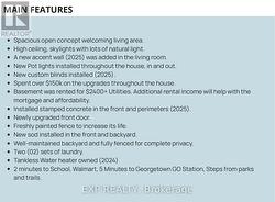 This detached home offers 6 bedrooms (3 main floor + 3 legal basement) & 4 full bathrooms with a legal basement completed in Nov 2024, and was rented for $2,400 plus utilities, located in the heart of Georgetown. Walking distance to Schools, Walmart, mall, trails and parks. The main floor features an open-concept layout with a newly installed accent wall and skylights. Fully functional kitchen with quartz countertops & ample cabinetry. The dining area has big windows providing lots of natural light. Pot lights and custom blinds were installed throughout the house. The basement is finished with a separate laundry, huge windows, and new pot lights, perfect for a growing family, multi-generational living, or generating rental income. Brand new exterior pot lights (2025), stamped concrete (2025) driveway, patio and sidewalks, huge backyard has new sod (2025) installed throughout. (id:27)
