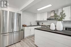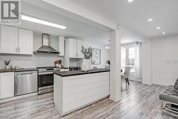 Perfect for first-time buyers, this move-in-ready two bedroom, one bath thoughtfully updated home on a fully fenced lot. The welcoming front entrance features pot lights and wood-look flooring that continues throughout much of the home. The bright eat-in kitchen is beautifully updated with modern cabinetry, countertops, backsplash, island, updated lighting, and stainless steel appliances including a gas stove. The living room offers patio doors that walk out to a private backyard with a wood deck, shed, BBQ, and patio umbrella-ideal for entertaining or relaxing outdoors. The primary bedroom includes wood-look flooring, pot lights, and an organized closet system, while the second bedroom also features matching flooring and pot lights. The four-piece bathroom offers a soaker tub, pedestal sink, vanity mirror, and pot light. The lower level provides laundry with a new dryer, built-in shelving, ample storage, and a rough-in for a future bathroom. Additional updates include exterior siding and eaves troughs, updated flooring, baseboards, trim, interior doors, pot lights, thermostat, exterior security system, updated electrical plus a 100 AMP panel, and has no rental equipment. Located in a great neighborhood close to the fantastic shops, restaurants and all that it has to offer. (id:27)