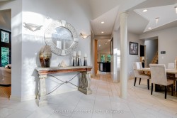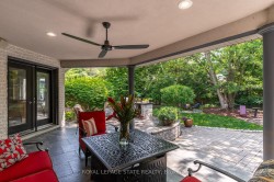 Located on a quiet court in Ancaster's prestigious Oakhill neighbourhood, 34 Harrington Place is a one-of-a-kind bungaloft designed for elegant living and unforgettable entertaining. Set on a pie-shaped, nearly half-acre lot with an impressive 217 ft across the rear, this custom-built Atherton home is surrounded by estate properties and award-winning Trillium gardens that elevate the curb appeal and outdoor experience. Boasting almost 5,000 sqft of impeccably finished living space, this home offers 3+1 bedrooms, 4 full baths, and a layout that perfectly blends everyday comfort with timeless sophistication. The main floor features a gourmet eat-in kitchen with custom cabinetry, cathedral ceiling, and access to a covered porch, flowing into a striking 12-ft great room with gas fireplace and floor-to-ceiling windows overlooking the oasis backyard. A formal dining room provides the ideal setting for hosting family gatherings and elegant dinner parties. The luxurious main-floor primary suite includes a cozy gas fireplace, an oversized walk-in dressing room, and a 5-pc spa-inspired ensuite. Also on the main level: a large private office, a full laundry room, and a stylish guest bath with direct outdoor access-perfect for rinsing off after a dip in the custom-designed hot and cold soaker pool spa or post-garden clean-up. Upstairs, two well-appointed bedrooms, a full bath, and a versatile loft area offer space for teens, guests, or a second home office. The bright walk-out basement features a 3-sided gas fireplace, spacious recreation room, kitchenette/bar, 4th bedroom, full spa bath, gym area, and abundant storage-ideal for in-laws or extended family. The backyard is a showstopper: private, lush, and tailored for gatherings large or small. Multiple seating and dining areas, a covered porch, and the signature pool spa create an outdoor sanctuary you'll enjoy in every season. This is more than a home-it's a statement of lifestyle in one of Ancaster's most exclusive enclaves.